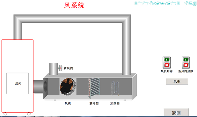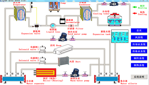(3),系統(tǒng)故障運行演示:在配置有實物中央空調(diào)實訓考核裝置時,在軟件演示故障時系統(tǒng)動畫與實物實時故障同步,讓學生更好地撐握空調(diào)原理、操作方法,如壓縮機系統(tǒng)、制冷系統(tǒng)、制熱系統(tǒng)、風系統(tǒng)、集中送風系統(tǒng)、半集中送風系統(tǒng)的原理過程。