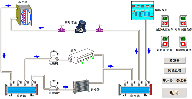 (1)、系統(tǒng)主要部件說明組成:如壓縮機、卻水泵、冷卻風機、風機盤管、分水器、集水器、表冷器等。