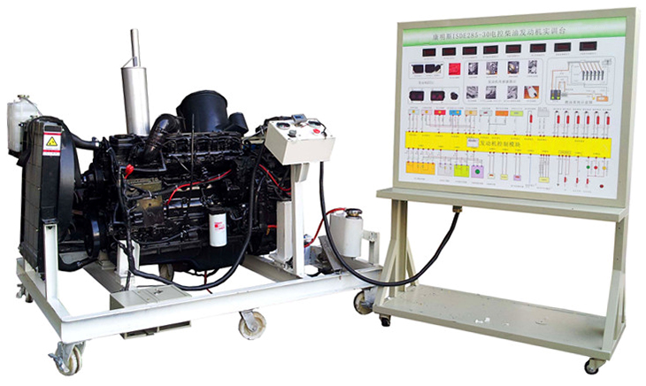 柴油發(fā)動機總成、組合儀表、發(fā)動機控制單元、散熱系統(tǒng)(水箱、風(fēng)扇、上下水管)、排氣系統(tǒng)、進(jìn)氣系統(tǒng)(進(jìn)氣軟管、空氣濾清器總成)、原車電路原理圖板及檢測端子面板、蓄電池、電源總開關(guān)、燃油箱、油水分離器、油門踏板裝置、可移動機臺架、臺架高溫及轉(zhuǎn)動等部位加裝防護(hù)裝置等。