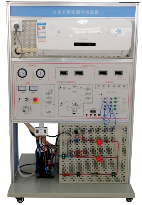 2、裝置直觀展示了空調(diào)的系統(tǒng)結(jié)構(gòu)和工作原理,便于教學(xué)演示講解及學(xué)生對課本知識的理解掌握。配置的交流電壓表、交流電流表、溫度表、真空壓力表以及相應(yīng)的信號指示燈,使整個空調(diào)系統(tǒng)的實時工作狀態(tài)一目了然;