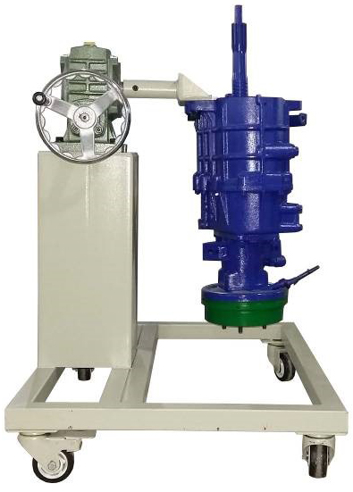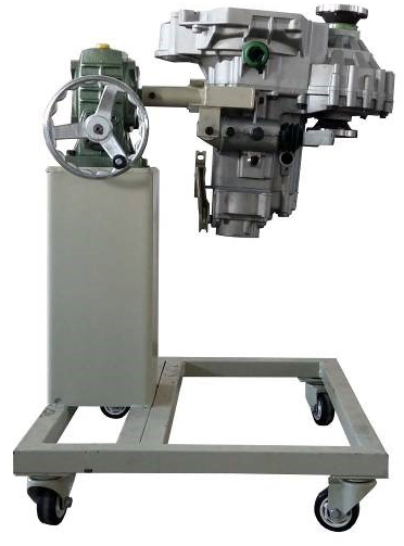 采用減速翻轉(zhuǎn)機構(gòu),可使變速器旋轉(zhuǎn)任意角度,并能任意位置鎖止,便于學生從不同的角度進行拆卸和裝配。