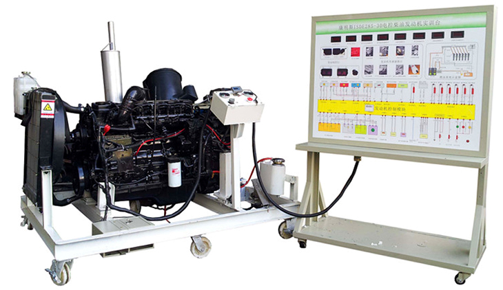 柴油發(fā)動機總成、組合儀表、發(fā)動機控制單元、散熱系統(tǒng)(水箱、風(fēng)扇、上下水管)、排氣系統(tǒng)、進氣系統(tǒng)(進氣軟管、空氣濾清器總成)、原車電路原理圖板及檢測端子面板、蓄電池、電源總開關(guān)、燃油箱、油水分離器、油門踏板裝置、可移動機臺架、臺架高溫及轉(zhuǎn)動等部位加裝防護裝置等。
