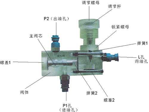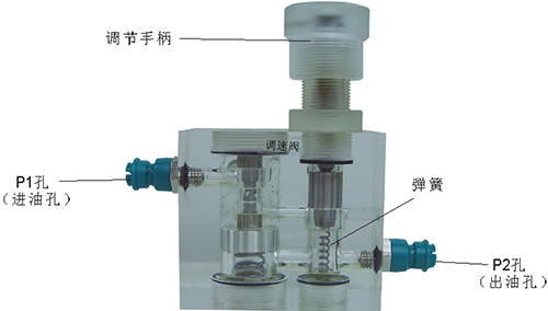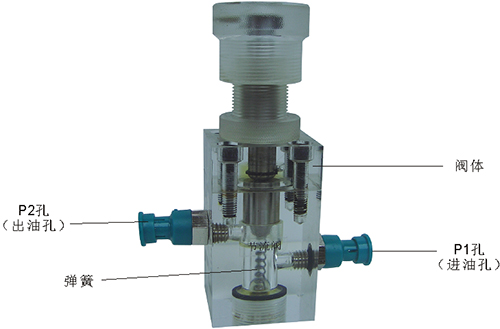 2、溢流閥結(jié)構(gòu)上參考了國產(chǎn)P-63B型低壓直動式溢流閥,其閥體閥蓋、鎖緊螺母、調(diào)節(jié)螺母、螺塞等采用了進(jìn)口透明有機(jī)玻璃材料精制而成,閥芯、調(diào)節(jié)桿采用了45#中碳鋼材料。并配合彈簧,油接頭,密封圈等標(biāo)準(zhǔn)件裝配而成,通過它可明確地觀察到閥芯、彈簧、油孔等結(jié)構(gòu)及其運(yùn)行過程,具有形象逼真,性能可靠等優(yōu)點(diǎn)。它即可作為教學(xué)模型,也可以作為液壓實(shí)驗(yàn)元件進(jìn)行實(shí)驗(yàn)演示。