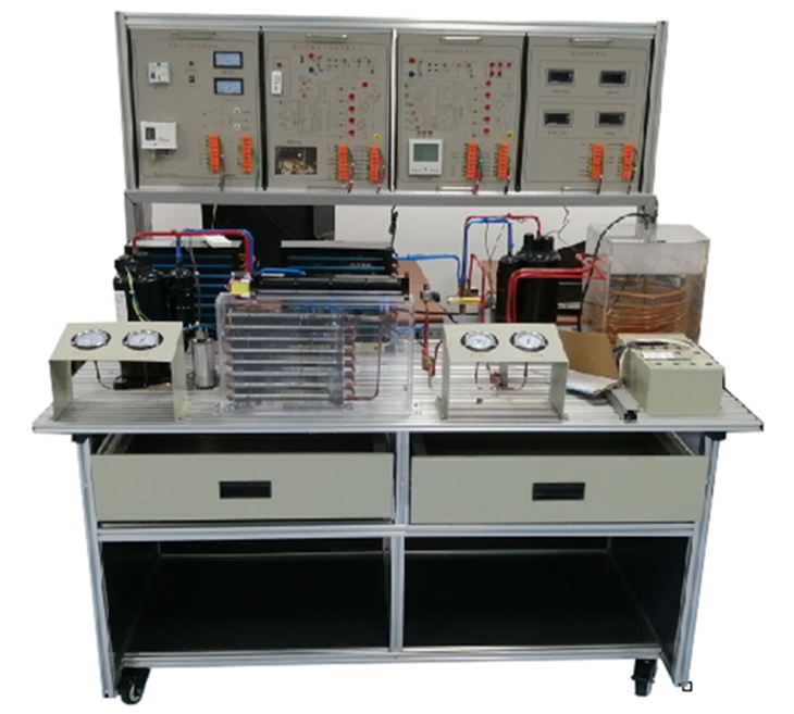 制冷與制熱系統(tǒng)技能實(shí)訓(xùn)裝置該產(chǎn)品包含了制冷、熱力學(xué)、傳熱學(xué)和電氣控制等技術(shù),主要由熱泵型家用空調(diào)系統(tǒng)和空氣源熱泵系統(tǒng)兩大部分組成。在鋁合金導(dǎo)軌式實(shí)訓(xùn)臺(tái)上安裝冷凝器、蒸發(fā)器、節(jié)流裝置、壓縮機(jī)、控制電路等,構(gòu)成一個(gè)典型的制冷裝置,電氣控制采用掛箱式,能進(jìn)行制冷系統(tǒng)的組裝、調(diào)試、運(yùn)行,真實(shí)呈現(xiàn)制冷裝置的工作過(guò)程,通過(guò)對(duì)制冷系統(tǒng)的安裝、保壓、檢漏、抽真空、電氣連線(xiàn)、加氟、系統(tǒng)調(diào)試及工況調(diào)整等,完成對(duì)學(xué)生的現(xiàn)代制冷與空調(diào)系統(tǒng)設(shè)備安裝、調(diào)試和維修技能訓(xùn)練。